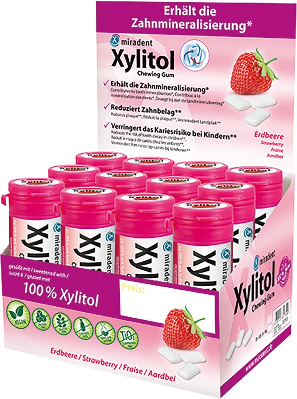 Produktinformationen "Xylitol Chewing Gum Display 12 Dosen x 30 Stück Erdbeere"