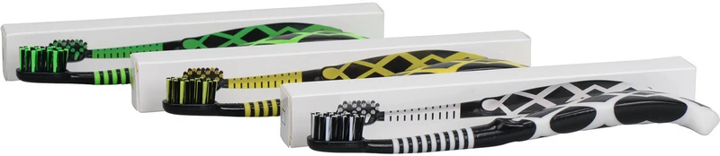 Unsere Zahnbürsten werden einzeln in hygienischer Folie verpackt geliefert. Der Borstenkopf ist altersgerecht und hat ein planes Borstenfeld mit abgerundeten Borstenenden. Der Zwei-Komponenten-Griff ist ergonomisch geformt. Die Bürsten sind kippsicher ablegbar.