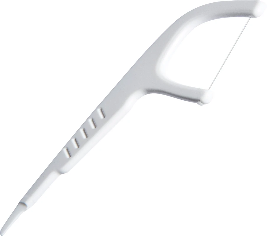 Ideale Kombination aus Zahnseide und Zahnstocher. Ungewachste Zahnseide, fest gespannt auf einem handlichen Halter. Praktische Kombination.