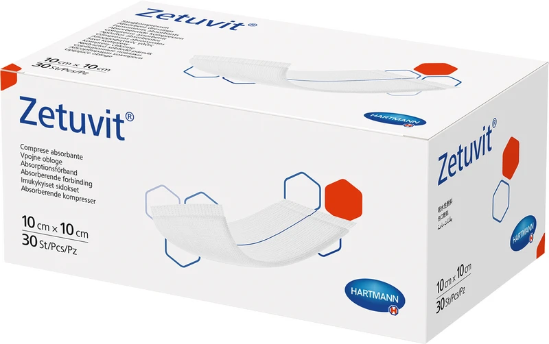 Zetuvit® steril/unsteril ist eine Saugkompresse für den Einmalgebrauch, die aus glattfaserigen Zellstoff-Flocken besteht. Ihre Rückseite weist eine hydrophobe Vliesschicht auf, die wasserabweisend und luftdurchlässig ist, und sie ist umhüllt von einer Zellstofflage zur Sekretverteilung. Das gesamte Produkt ist von einem nicht verklebenden, hydrophilen Vlies umgeben. Die wundabgewandte Seite ist durch einen blauen Streifen gekennzeichnet.