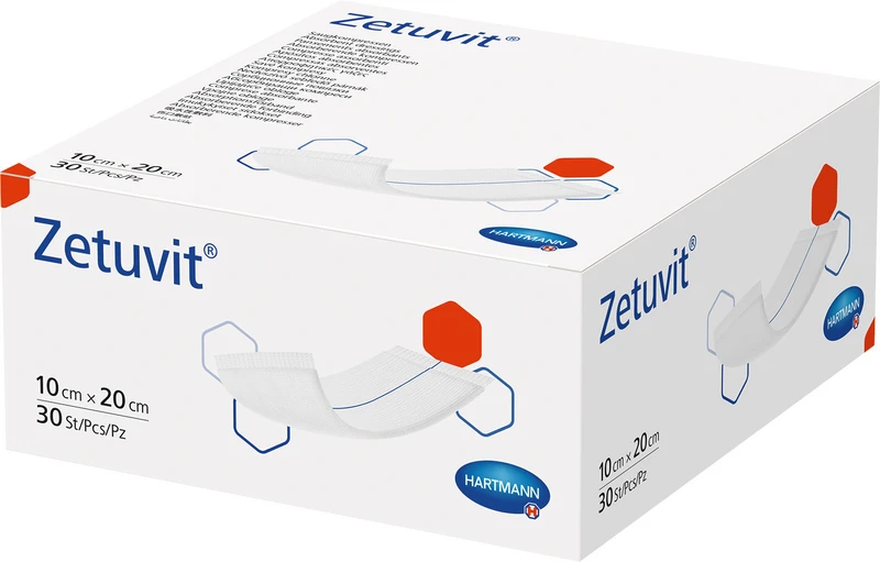 Zetuvit® steril/unsteril ist eine Saugkompresse für den Einmalgebrauch, die aus glattfaserigen Zellstoff-Flocken besteht. Ihre Rückseite weist eine hydrophobe Vliesschicht auf, die wasserabweisend und luftdurchlässig ist, und sie ist umhüllt von einer Zellstofflage zur Sekretverteilung. Das gesamte Produkt ist von einem nicht verklebenden, hydrophilen Vlies umgeben. Die wundabgewandte Seite ist durch einen blauen Streifen gekennzeichnet.