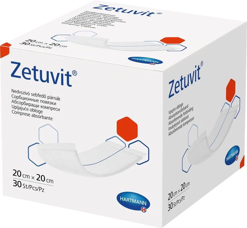 Zetuvit® steril/unsteril ist eine Saugkompresse für den Einmalgebrauch, die aus glattfaserigen Zellstoff-Flocken besteht. Ihre Rückseite weist eine hydrophobe Vliesschicht auf, die wasserabweisend und luftdurchlässig ist, und sie ist umhüllt von einer Zellstofflage zur Sekretverteilung. Das gesamte Produkt ist von einem nicht verklebenden, hydrophilen Vlies umgeben. Die wundabgewandte Seite ist durch einen blauen Streifen gekennzeichnet.